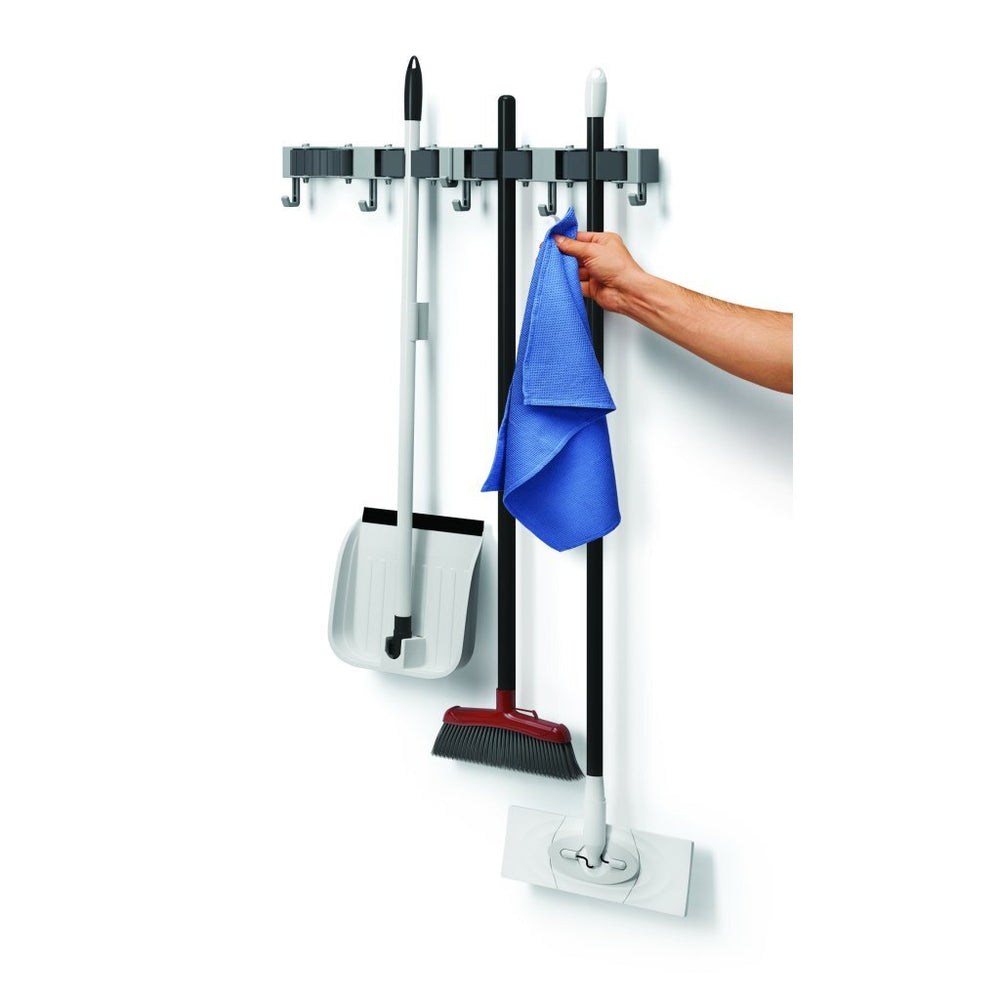 um prático rack que você aparafusa na parede e com o qual pode pendurar as vassouras ou esfregões corretamente. Você também pode prender suas ferramentas de jardim e armazená-las de maneira conveniente. Você pode facilmente pressionar a haste no suporte e removê-la facilmente. Além disso, o Hangup possui ganchos extraíveis para que você também possa pendurar outros itens, como pás e vassouras, panos de limpeza e ferramentas menores. Cor: cinza.