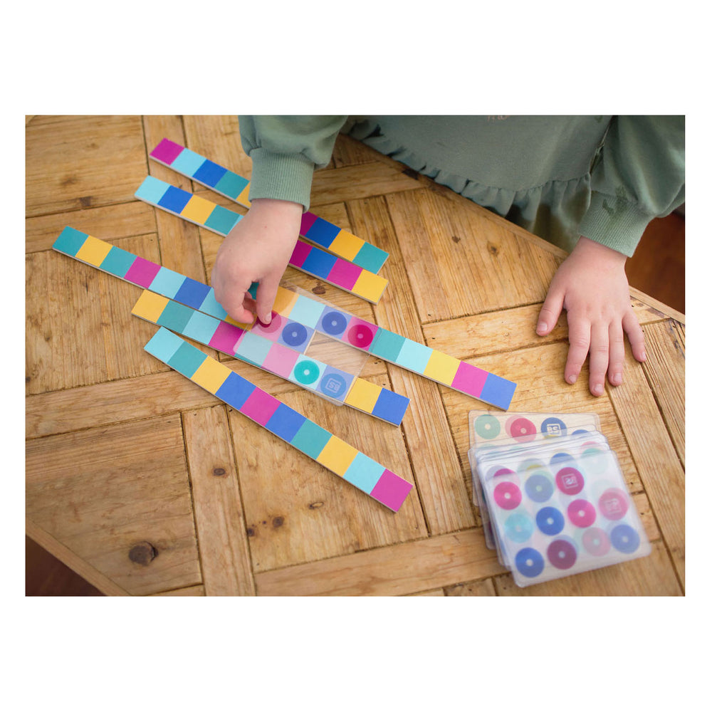 Upside down and sideways. Move the strips to create the correct pattern. Place the card on strips to check if you did it right! What do you learn from this game? • competitive challenge • pattern recognition • solution-oriented thinking Features • Suitable for 1-2 players • Material: plywood, PET • Contents: 12 strips, 40 transparent cards • Recommended age: 8+