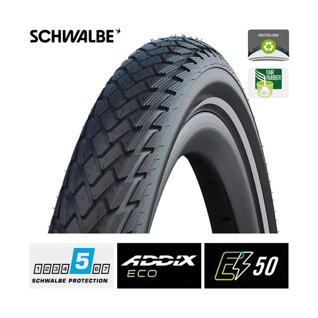 Schwalbe Tire Marathon GreenGuard je klasična in visokokakovostna turneja. Ta pas je s svojo velikostjo 26 x 1,75 in širino 47 primeren za kolesa in e-kolesa. Skupina ima sodoben in športni profil z značilnim maratonskim značajem. Zahvaljujoč plasti GreenGuard izjemno elastične naravne gume je zelo dobra zaščita. Ta plast je debela 3 mm in za 1/3 narejena iz recikliranih izdelkov iz lateksa. Stranska stena 'proti staranju' zagotavlja, da pnevmatika traja dlje, tudi z nizkim tlakom v pnevmatikah. Maraton GreenGuard je primeren tudi za e-kolesa do 50 km/h.