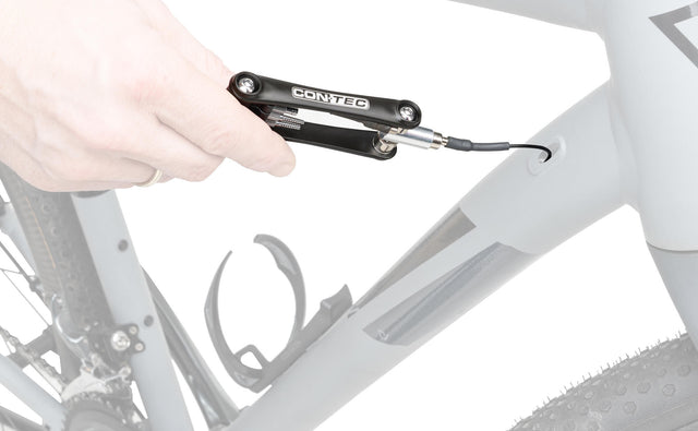 Presentatieverpakking, voor frames met interne kabelgeleiding, set bestaande uit 1,3 m lange trekhulp met magneet, adapter voor binnenkabels, buitenkabels, hydraulische leidingen, Di2-kabels, geleidingsmagneet met opbergruimte voor adapter, RVS, incl. opbergdoos van kunststof 1 = Adapter voor hydraulische leidingen 2 = Adapter voor mechanische kabelmantels 3 = Di2 E-Tube adapter 4 = Magneetconnector voor adapter 5 = Geleidingsmagneet Die „TFM“, also „Tools for Mechanics“, decken den Grundbedarf für die wichtigsten Fahrradwerkzeuge ab. Mit diesen Tools lassen sich die nötigsten Einstellungen und Wartungsarbeiten an deinem Bike vornehmen.Der TFM-Cable Guy ist der ideale Helfer bei Fahrrädern mit interner Zugführung. Sei es eine mechanische Variosattelstütze oder hydraulische Bremse – wer regelmäßig Teile am Bike austauscht, die eine Kabelführung durch den Rahmen erfordern, kennt den Aufwand, der dahintersteckt. Mit dem Verlegungswerkzeug TFM-Cable Guy reduziert sich dieser Aufwand erheblich. Das Tool umfasst eine 1,3 m lange Einziehhilfe mit Magnet, sowie Adapter für Züge, Kabelhüllen, hydraulische Leitungen und Di2-Kabel. Ein Führungsmagnet mit Aufbewahrung für die Adapter komplettiert das Multifunktionswerkzeug.1 = Adapter für Hydraulik-Leitungen2 = Adapter für mechanische Kabelhüllen3 = Di2 E-Tube Adapter4 = Magnet-Verbinder für Adapter5 = FührungsmagnetUnd so funktioniert’s: Schraube den passenden Adapter vom Tool ab und schraube es auf das eine Ende der Einziehhilfe. Verbinde dann das zu verlegende Kabel mit dem Adapter. Führe das Einziehhilfen-Ende mit dem Magnet zuerst in den Rahmen ein. Nutze dann den kraftvollen Gegenpol-Magneten am Tool, um die Einziehhilfe durch die Anziehungskraft beider Magneten durch den Rahmen zu führen. Das vorher verbundene Kabel wird dann bis zu deiner gewünschten Position mitgezogen. Fertig!Wenn der TFM-Cable Guy nicht in Gebrauch ist, werden die Adapter sicher am Tool aufbewahrt und gehen nicht verloren. Das Werkzeug selbst ist außerdem auch nochmal durch eine inkludierte Kunststoffbox zur Aufbewahrung geschützt.
