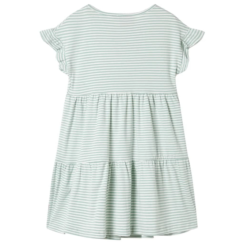 Denna barnklänning har en rund halsringning, ärmar med ruffles och 1 påse på bröstet. Denna myntafärgade barnklänning har ett ränder. Den korta barnklänningen är tillverkad av mjukt material med bomull och elastan, vilket gör den bekväm och andas.