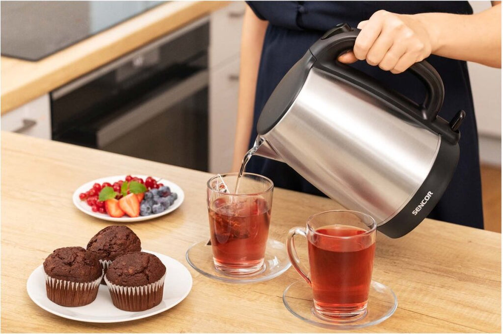 The Sencor SWK 1715S is a stylish, high-quality stainless steel kettle. It has a 1.7-liter capacity and 2200 watts of power. It features a removable, dishwasher-safe dirt and limescale filter and a water level indicator. Thanks to its 360-degree base, the kettle is easy to set up.