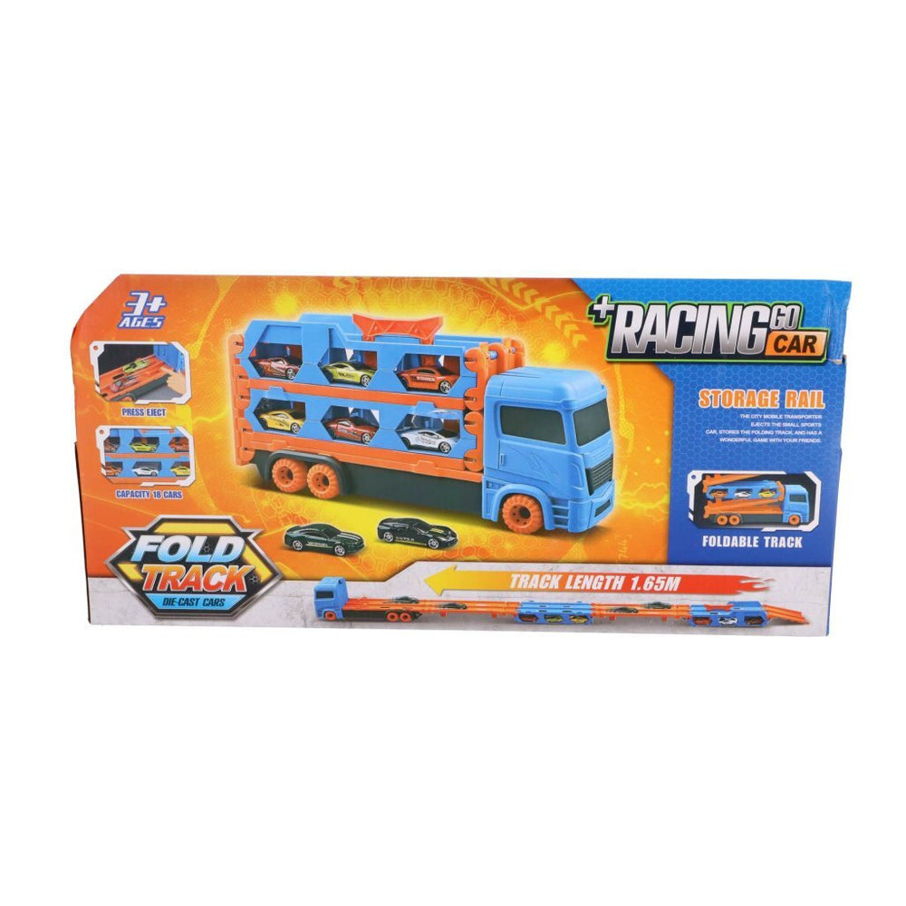 Den här coola lastbilen har plats för många racerbilar på sin trailer - du kan få plats med mer än 18 bilar på den! Bilen kan också fällas ut för att bilda en racerbana på upp till 1,65 meter! Tryck på knappen för att starta dina bilar. Inkluderar 2 metallfordon. Lämplig för barn från 3 år. Pop-up bil formgjuten med 2 metallbilar. Den här coola lastbilen har plats för många racerbilar på sin trailer - du kan få plats med mer än 18 bilar på den! Bilen kan också fällas ut för att bilda en racerbana på upp till 1,65 meter! Tryck på knappen för att starta dina bilar. Inkluderar 2 racingbilar i metall. Lämplig för barn från 3 år.