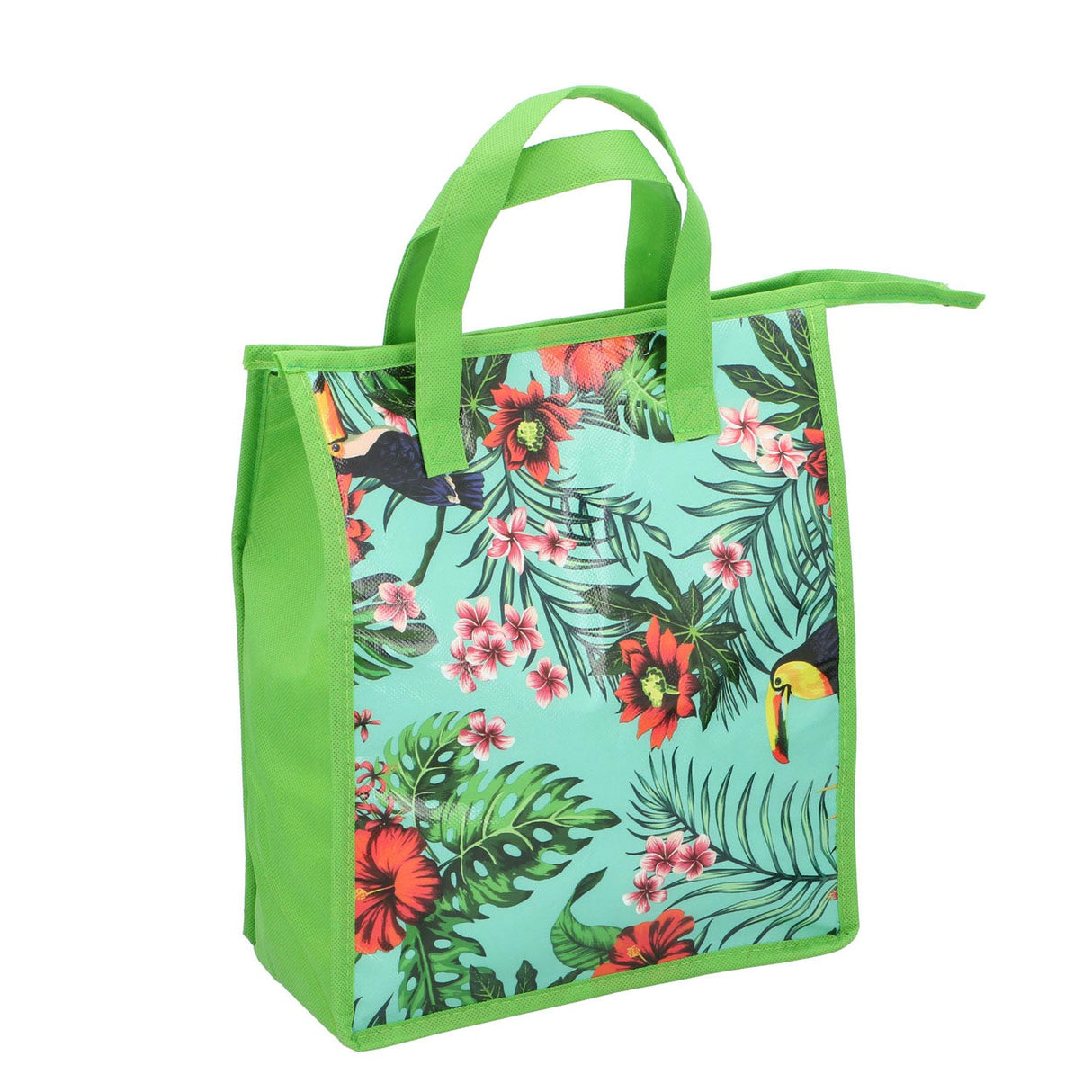 Denna svalare tropiska håller din mat och dryck sval under varma dagar. Med ett trevligt sommartryck av frukt eller tropiska blommor är denna svalare påse inte bara praktisk utan också snygg. Kylväskan har en kapacitet på 8 liter, så det finns tillräckligt med utrymme för alla dina kylda drycker och mat.